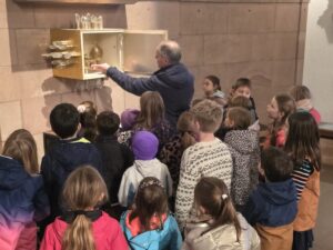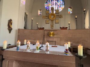 Auch in diesem Jahr gestalten die Kommunionkinder wieder eine Kommunionmappe, die sie später an ihre Zeit der Vorbereitung auf dieses wichtige Sakrament erinnern soll, das sie in der St. Laurentius-Kirche empfangen werden. Um den Kirchenraum besser kennenzulernen, trafen sich die Kommunionkinder mit ihren Familien und Pfarrer Kaufmann im Dezember im Gotteshaus zum „Kirche erleben“. Die Kinder stellten viele Fragen rund um unser Gotteshaus und durften auch einen Blick in die Sakristei werfen. Vielleicht entscheidet sich ha der ein oder die andere nach der Erstkommunion für den Ministrantendienst und darf dann dort öfter ein- und ausgehen?